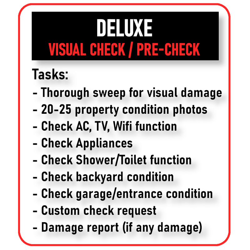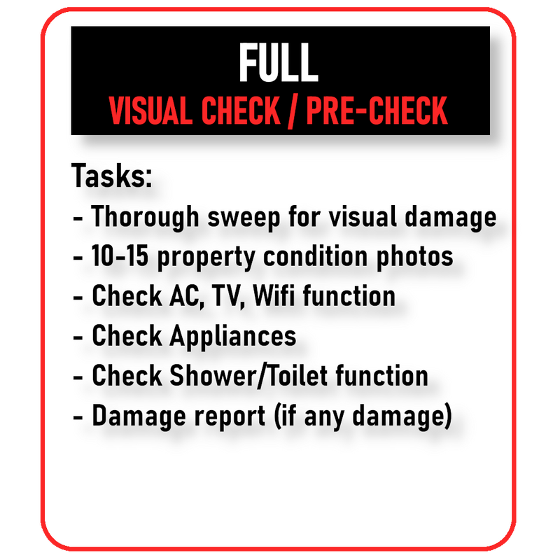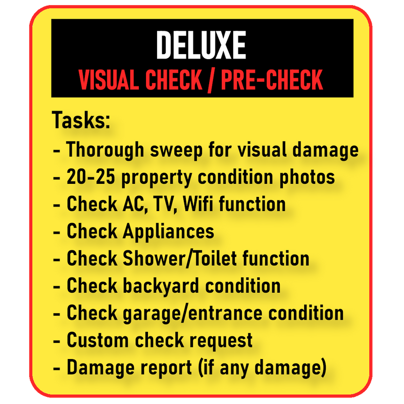A Visual Check is a quick, in-person inspection confirming your rental is clean, stocked, and secure between guest stays. This is especially useful for out-of-state hosts managing high-volume Airbnb properties in Las Vegas.